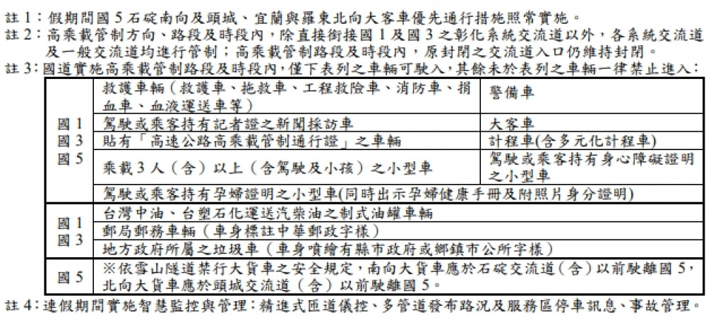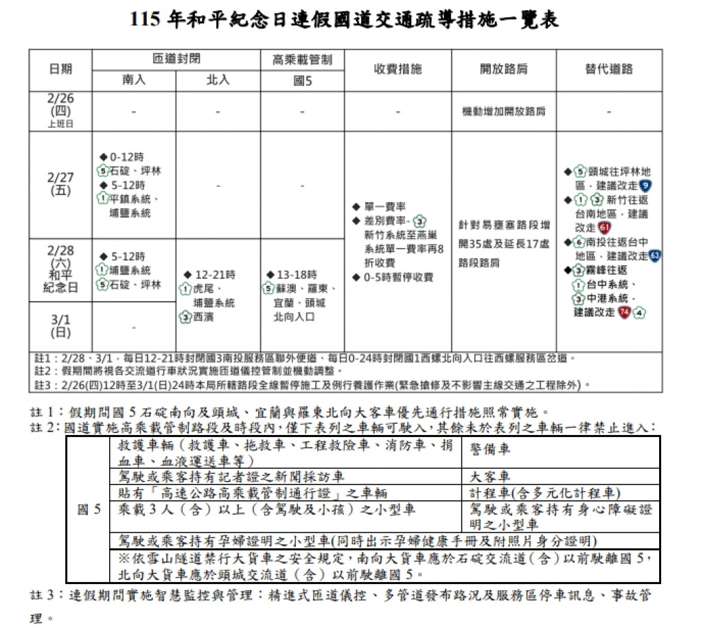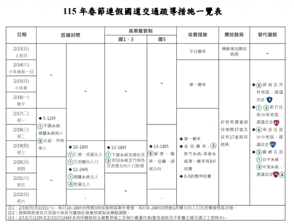 115年春節及和平紀念日(228)連續假期國道交通疏導措施一覽表