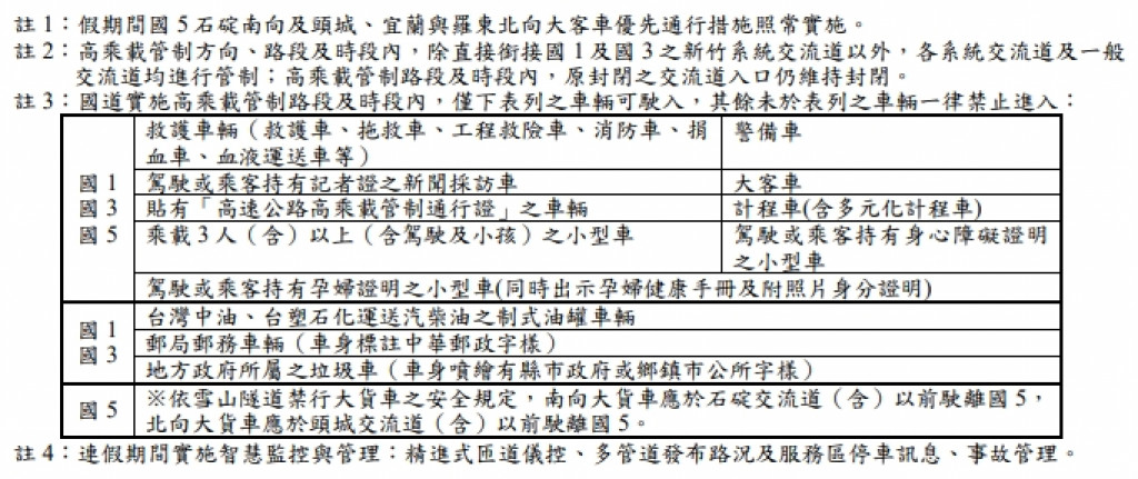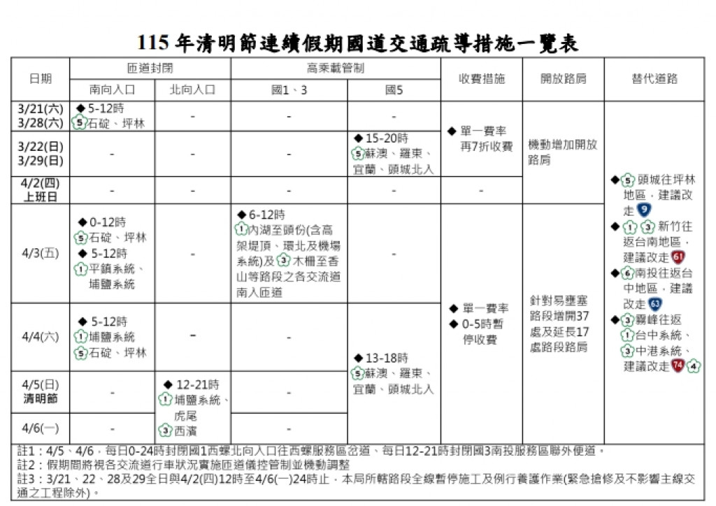 交通部高速公路局「115年清明節連續假期國道交通疏導措施一覽表」1份。