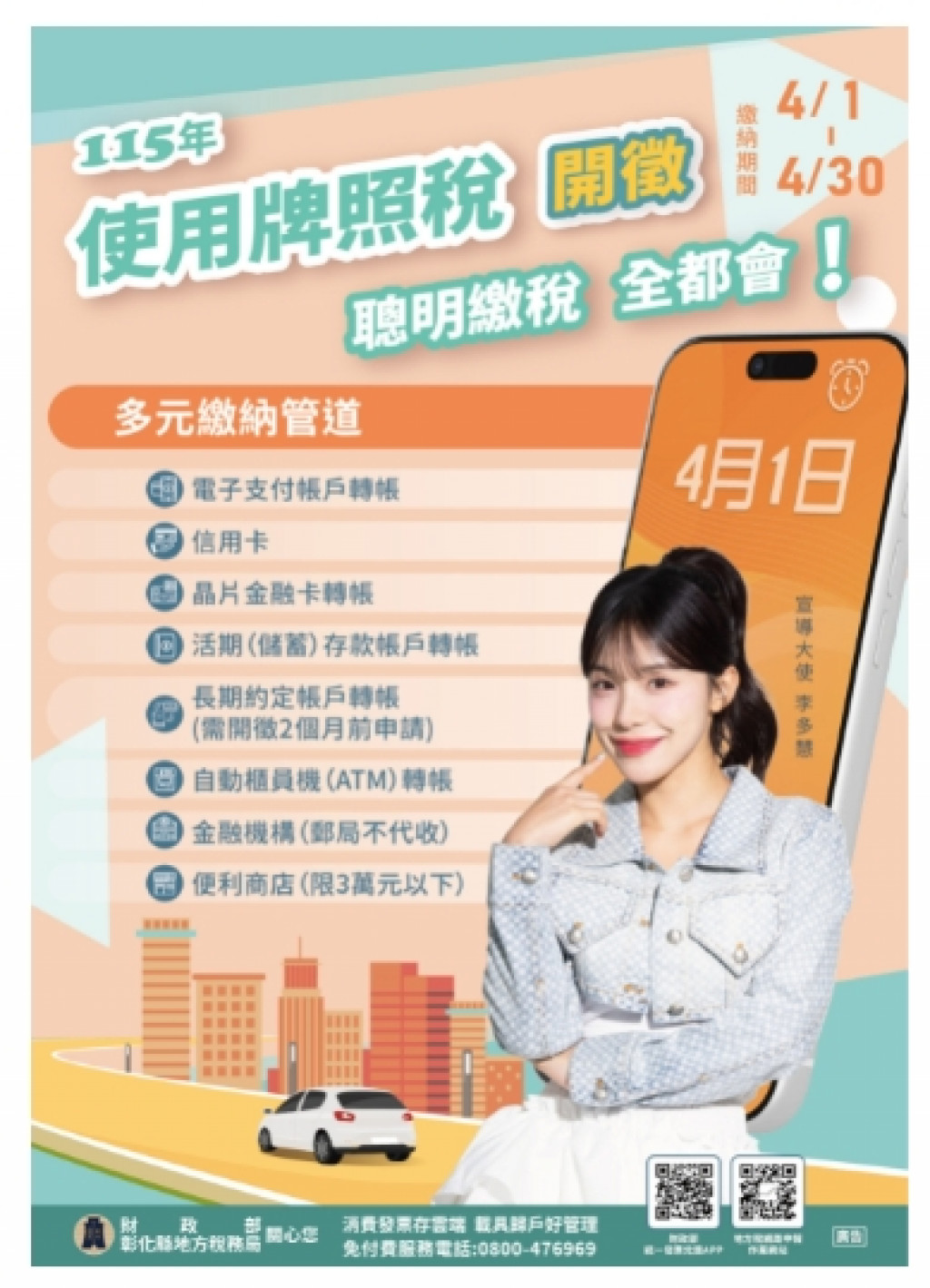 | (二) | 託播內容:115年使用牌照稅於4月開徵,繳納期間自4月1日至4月30日,請如期繳納,彰化縣地方稅務局關心您。 |